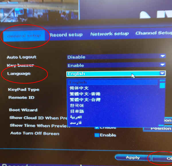 4. Valitse ylävalikosta GENERAL SETUP (jos ei valittuna) ja LANGUAGE (kolmas ylhäältä) ja alasvetovalikosta haluttu kieli (englanti ylimpänä)