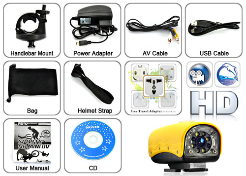 Toimitussisältö: Kamera, kantokassi, mini USB, USB-kaapeli, AV-kaapeli, kaapeli + 1 valkoinen, audiokaapeli, ohjaustankokiinnike, kypärähihna, ajuri-CD, 100-240V seinävirtalähde, ohjekirja (engl.)