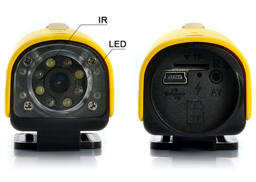 Värit: keltainen · Kuvakenno: CMOS 5,0 megapikseliä · Laajakulmalinssi: 120 astetta · Videoformaatti: AVI (1280x720, 30 kuvaa sekunnissa) · Video: NTSC / PAL · Kuva: JPEG (2560x1920) · Mikrofoni: Ei · Minimi valontarve LUX: 1 · LED-valaistus: 4 viileän valkoisella ja 4 infrapunalediä pimeässä kuvaamiseen · LED merkkivalo: virta, tallennus · Vesitiiviys: IP68, vesitiivis jopa 20 metriä! · Max micro SD-kortti tukee: 32GB · Akun kapasiteetti: 900mAh · Akun kesto: 2 tuntia (ilman LED-valo) · Liitännät: 2,5 mm naaras AV out, Micro USB, Micro SD-korttipaikka · Mitat: 90mm x 41mm x 36mm · Paino: 45 g · Takuu 6 kk.